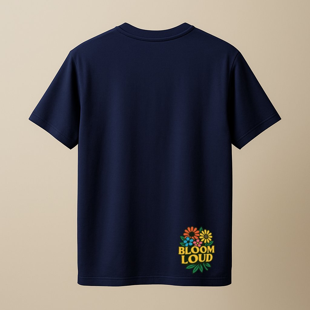 • Navy blue unisex t-shirt featuring a colorful cluster of flowers and the phrase “BLOOM LOUD” printed near the bottom hem back view