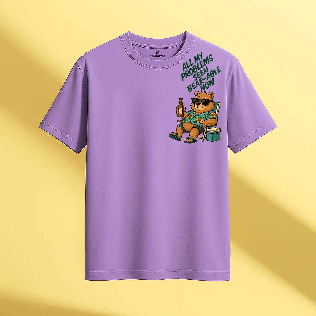 • Unisex lavender cotton T-shirt with a cartoon bear in sunglasses holding a drink and the quote "All My Problems Seem Bear-Able Now", regular fit with round neck and short sleeves front view