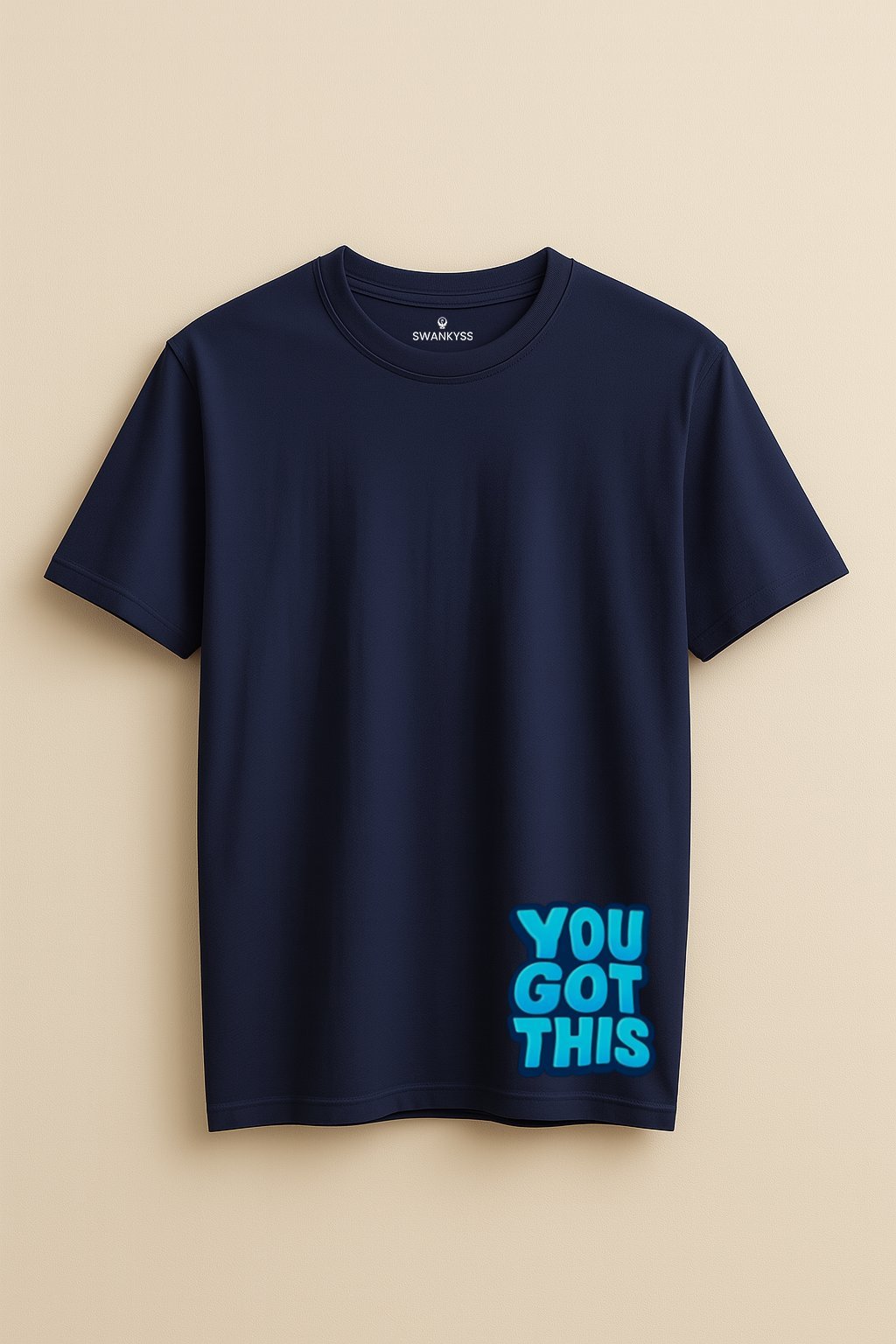 • Navy blue unisex t-shirt with “You Got This” bold blue text at hem – motivational quote shirt by Swankyss front view