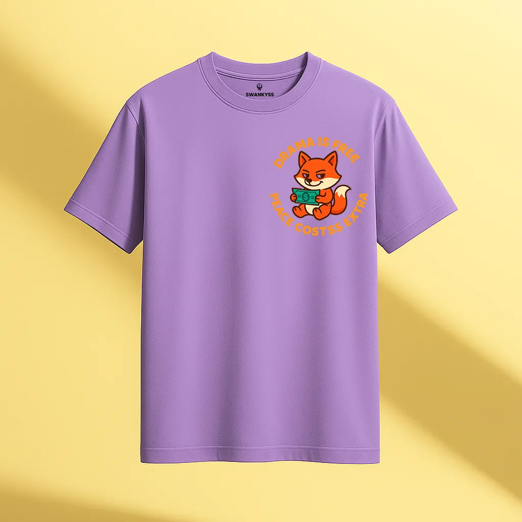 • Lavender t-shirt featuring a cartoon orange fox holding money with the quote "Drama is Free, Peace Costs Extra" in bold orange letters front view