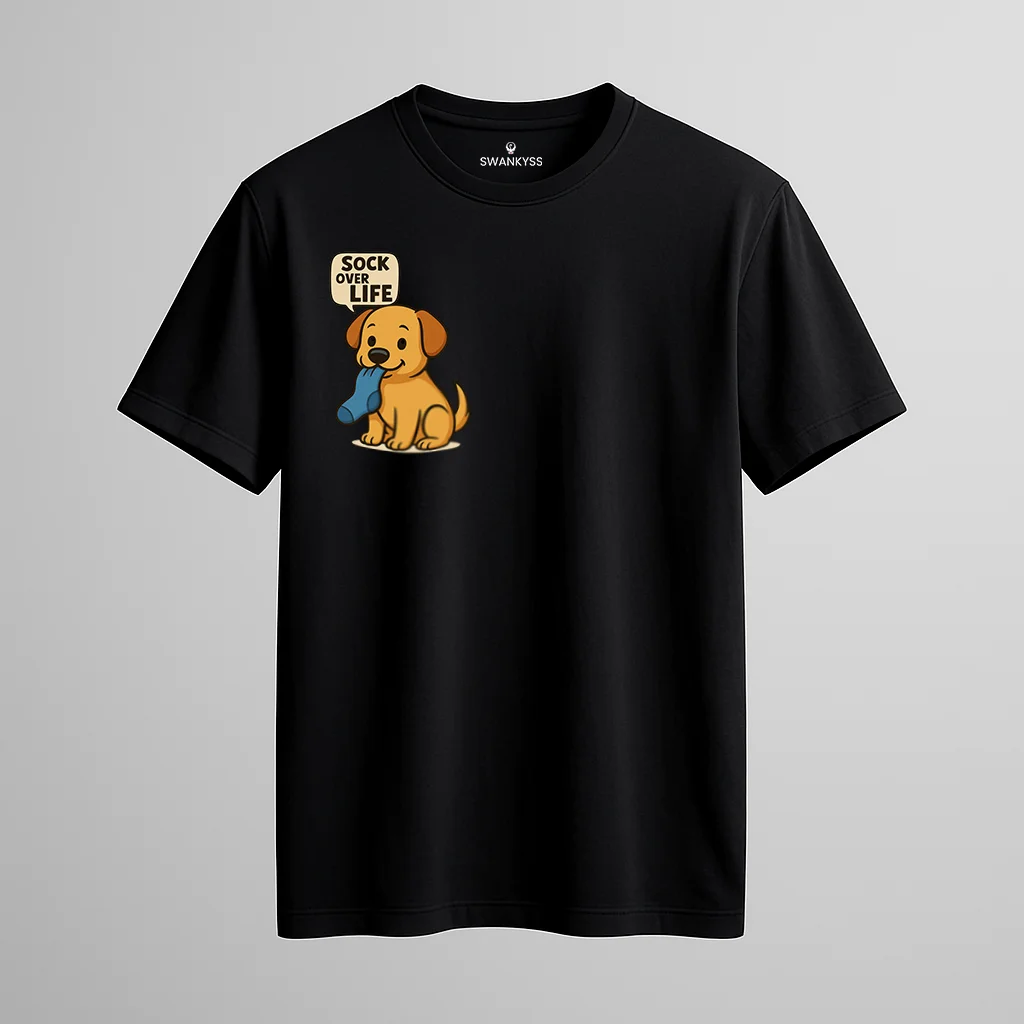The **Sock Over Life T-Shirt** blends humor, comfort, and sneaker culture in one black cotton essential.